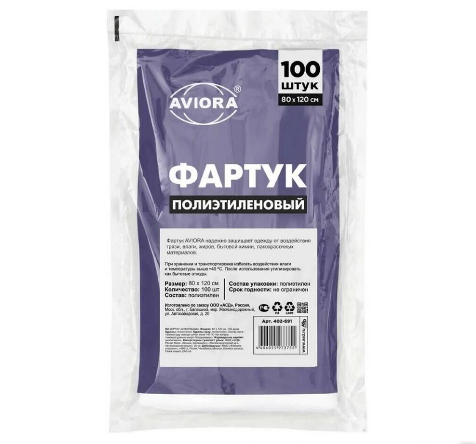 Фартук одноразовый полиэтиленовый AVIORA (80 х 120 см полиэтилен AVIORA100шт/уп)